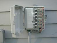 The Coop uses "protectors", electronic devices which are intended to minimize the possibility that lightning might damage the DSLAM in the barn by following the wiring into the barn. The protectors we use may be seen in a photograph.